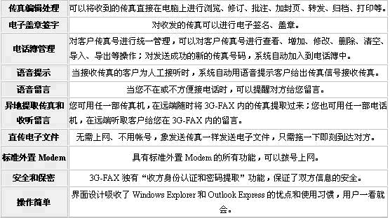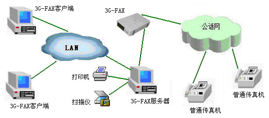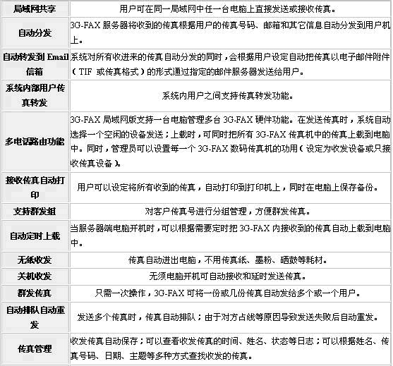 局域网版介绍 3G-FAX数码传真机局域网版由3G-FAX数码传真机硬件、3G-FAX局域网传真服务器软件和3G-FAX局域网传真客户机软件共同组成,系统使用C/S工作模式。 3G-FAX数码传真机局域网版充分利用大部分企业已有内部局域网的条件,等于让局域网上的每一个用户都拥有一台自己的专用数码传真机,大家就不用再为收发传真跑来跑去了。出差时,还可将别人发给自己的传真转发到电子邮件中,同时公司传真服务器内可备份所有收发过的传真。 3G-FAX数码传真机,让收发传真不再浪费纸张耗材,让传真操作从此轻轻松松。 主要功能介绍